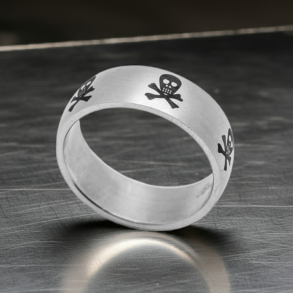 7.5mm Wide with a Stain Finish Stainless Steel. along with Black Skulls & Crossbones going all the way around this wedding band. Simply a cool ring.