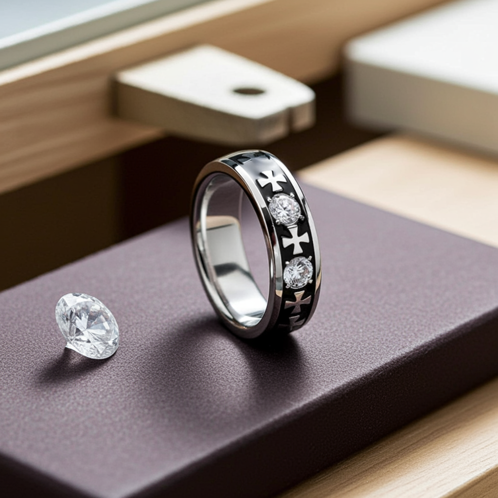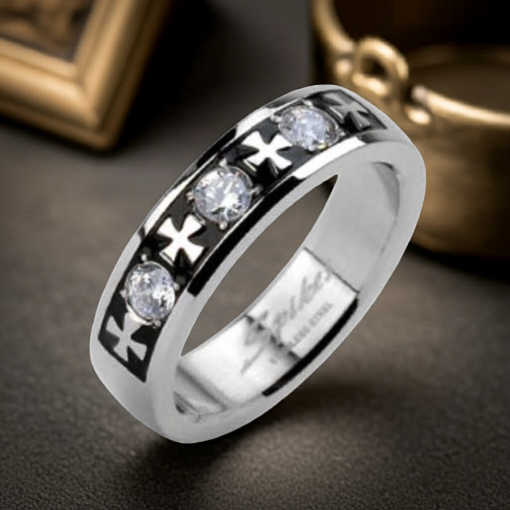 This 7mm wide Ring is a Medieval Masterpiece for your finger. It’s Rocking 4 Celtic Iron Crosses with 3 Glittery Clear Cubic Zirconia stones, all snugly Pave-set for a Smooth look. Forged from Indestructible Stainless Steel, it boasts a Bold Black Backdrop that makes the Details Shine, all polished to perfection. Perfect for Knights, Damsels, and anyone craving some Medieval Flair!