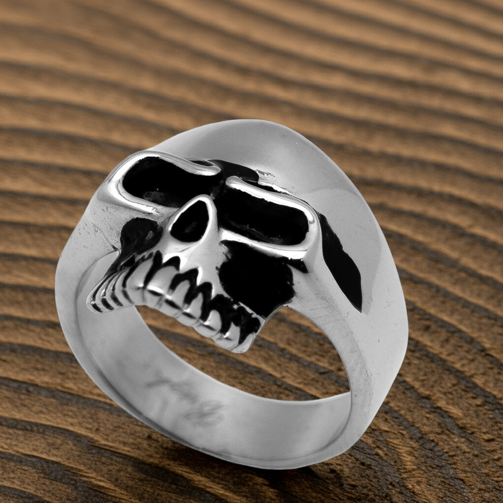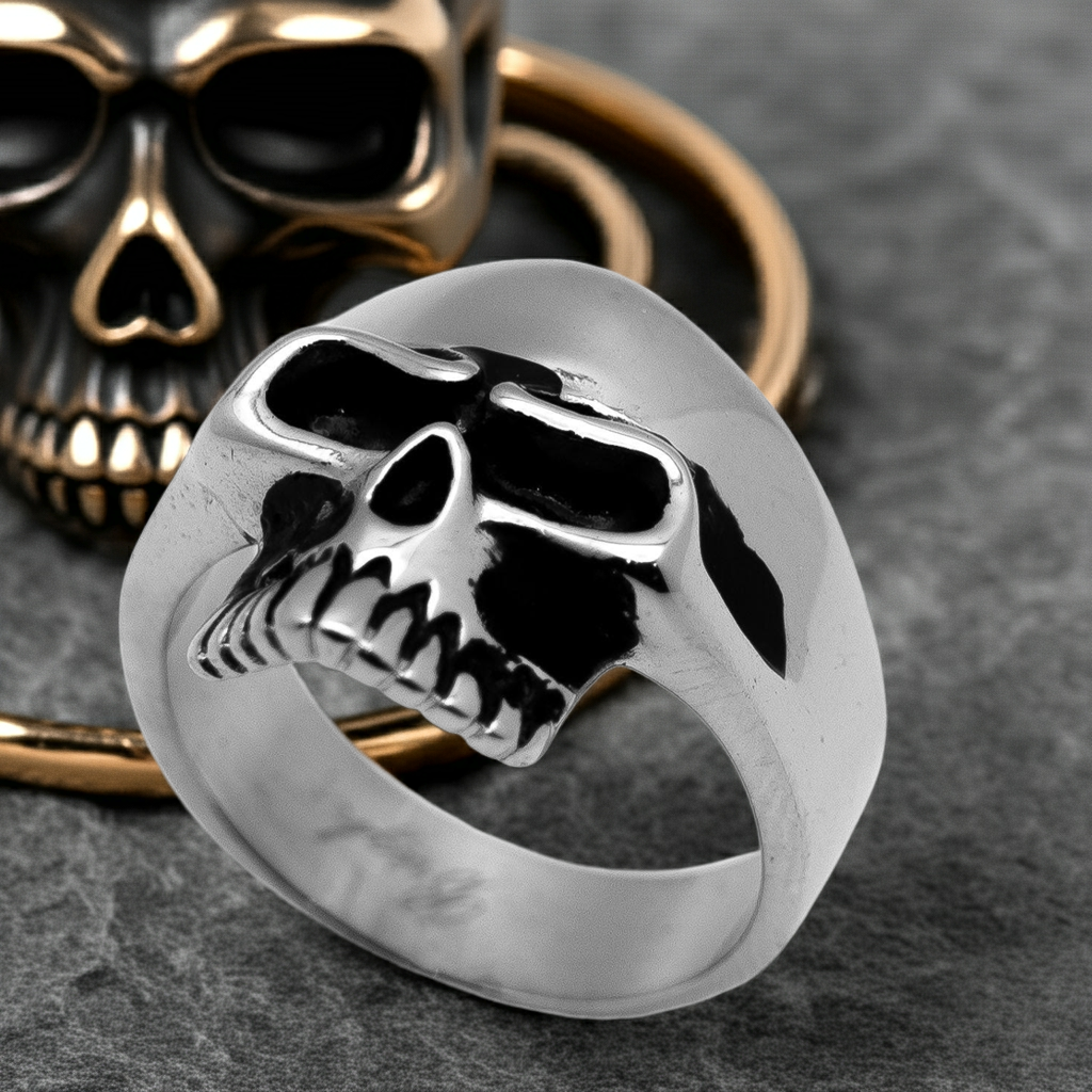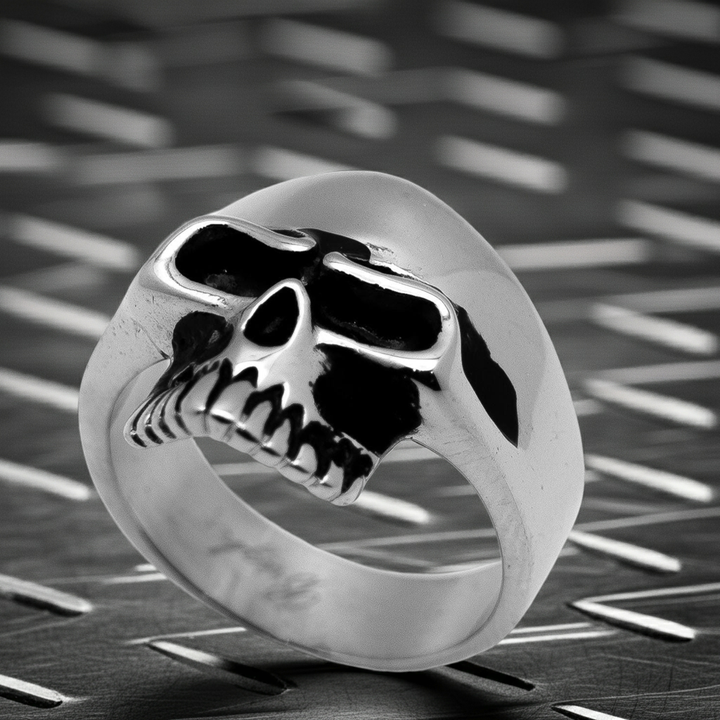 Phantom Half Jaw Skull Ring features the Iconic Missing Lower Jaw. With a High Polished Finish and Blacked-Out Eyes and Mouth, this Unisex Ring makes a Bold Statement. Check out all the sizes available for this Awesome Biker Jewelry Phantom Half Jaw Skull Ring! Biker Jewelry's Unisex Stainless Steel