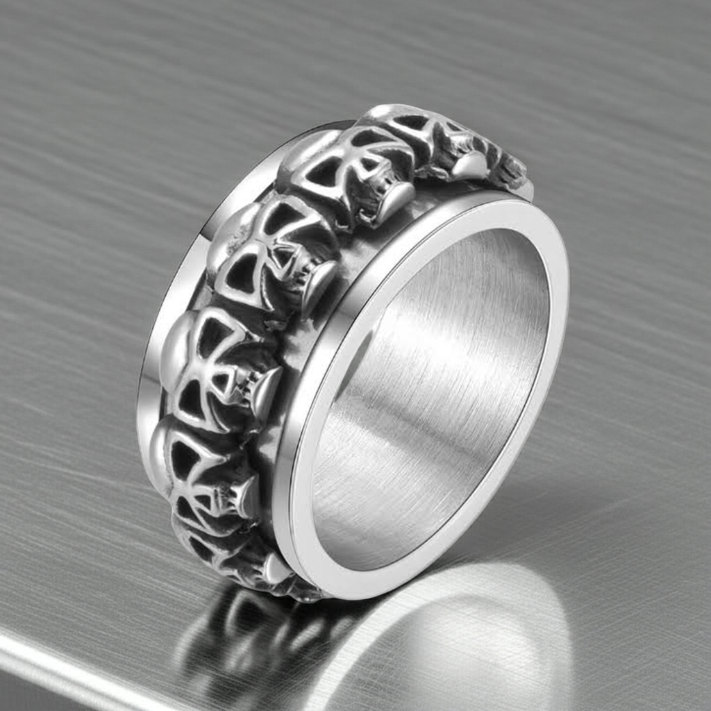 Unisex Wedding Band with a Twist—Literally! This 11mm wide Stainless Steel Ring Features Spinning Skulls Circling the Entire Band, offering a Bold and Stylish way to Say "Till Death Do Us Part."