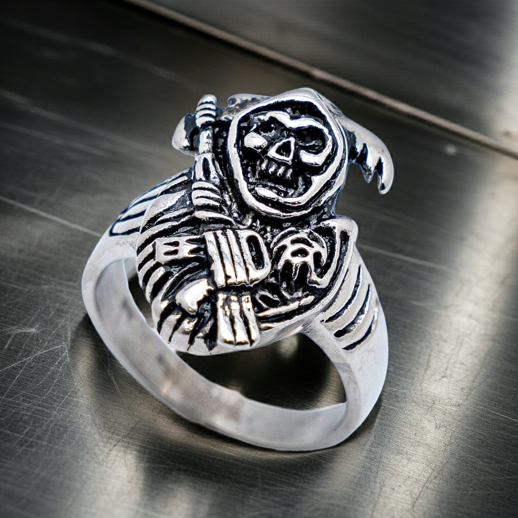 Medium in size flat to the finger strong stainless steel reaper ring.
