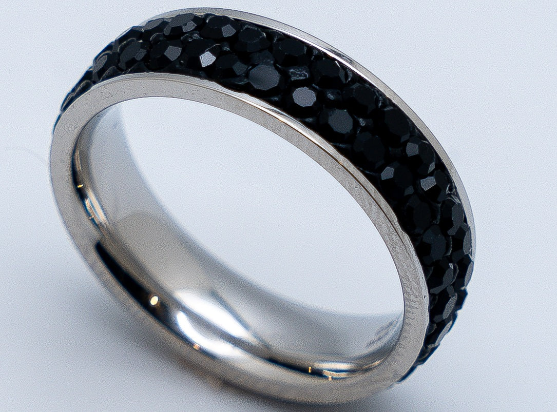 A simple stainless-steel band, this bling ring is fully wrapped in two rows of cut black stones. Works well for a wedding band also.