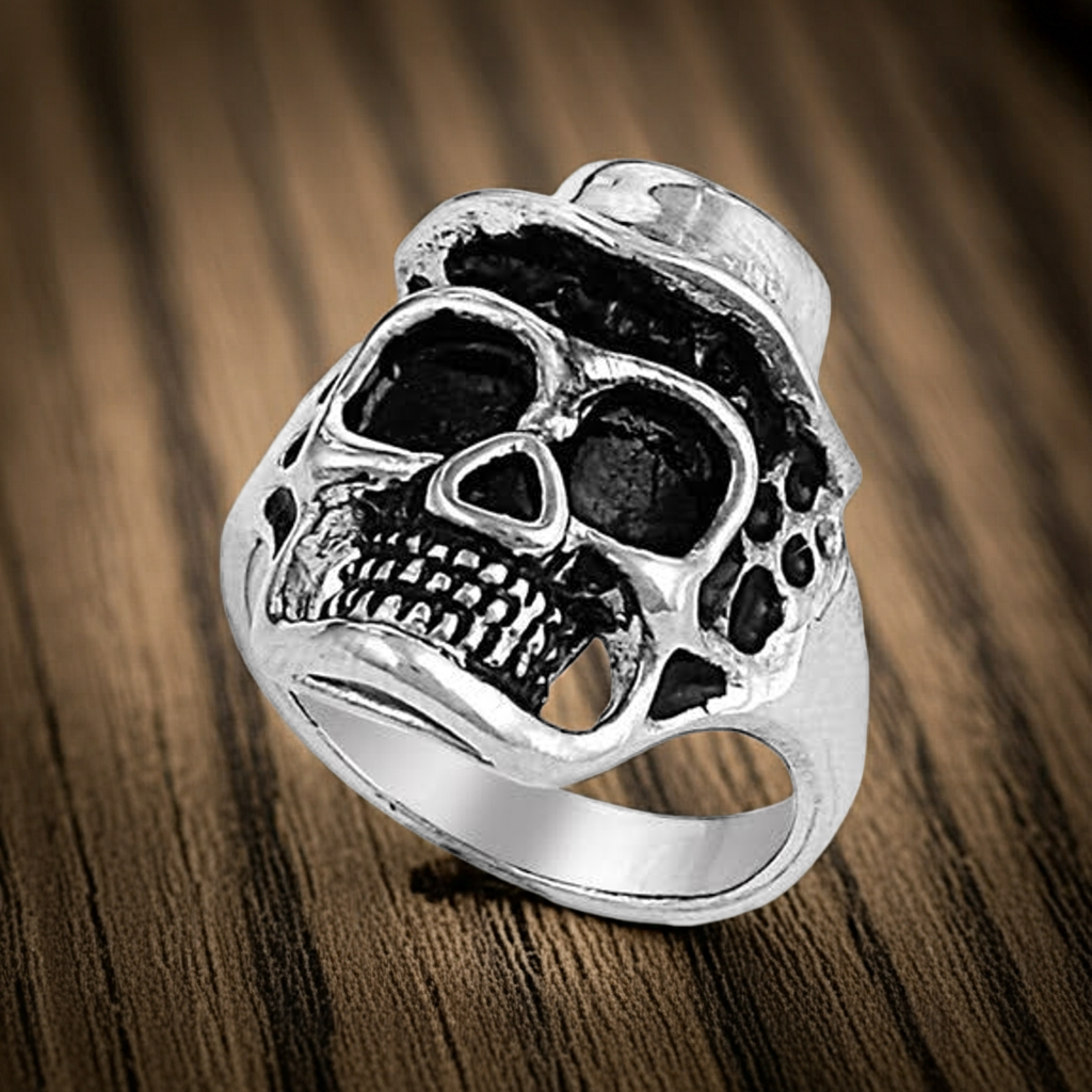 Men's Skull wearing a Top Hat Biker Ring. A Great Old School Biker Ring made in Solid Stainless Steel.