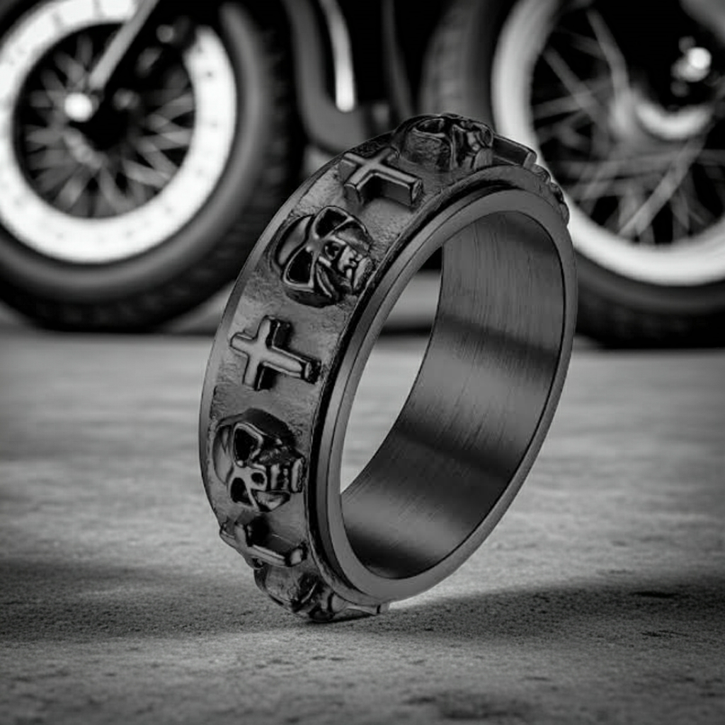 This Unisex Black Spinner ring is the Perfect Companion for your daily Escapades, showcasing a Bold Design of Raised Skulls and Crosses around the Band. Crafted from Durable Stainless Steel, it Resists Wear and Tear effortlessly, available in sizes 7 to 13 to suit your Daring Style. The 8mm Band and Spinner element combine Edgy Charm with a Fidget-Friendly Twist, making it an Ideal Piece for both Men and Women. A Must-Have Addition to any Biker Jewelry Lover's Collection!