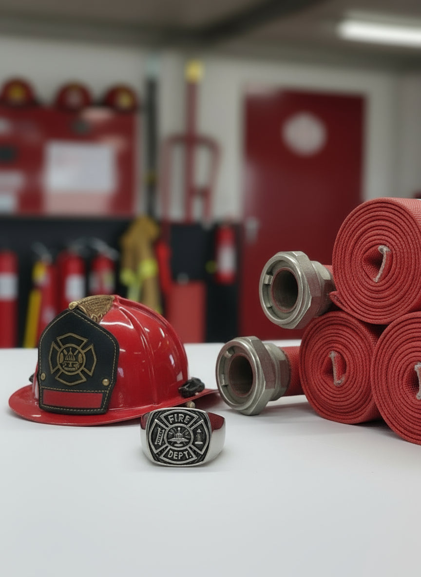 This Unisex Firefighter's Ring in Stainless Steel. The Black Firefighter's Maltese Cross Features Numerous Intricate Details. Within the Maltese Cross Design The words "FIRE" and "DEPT," along with Images of a Fire Hydrant, Ladder, and Helmet. The Black Background Enhances the Clarity of these Raised Details. The Rounded Square top, measuring 20 x 20mm wide and has been Forged from a Single Piece of 316L Stainless Steel, Ensuring Exceptional Durability. This 1st Responder Ring is Suitable for All whether you are a Volunteer Firefighter, Chief, or Anyone In-between Who Serves. Show your Dedication for Your Company.