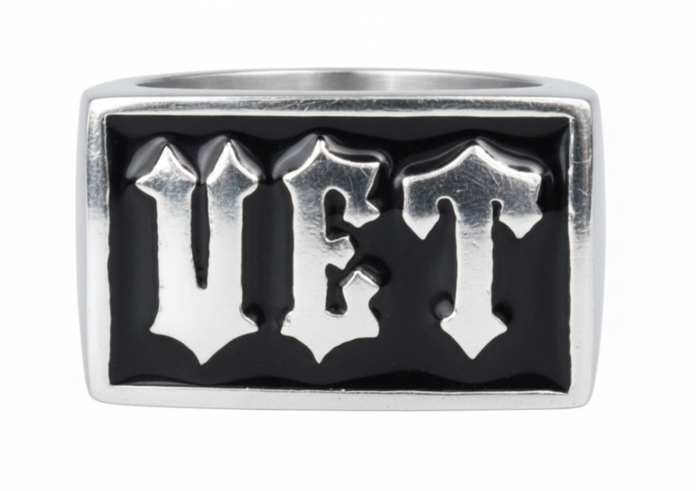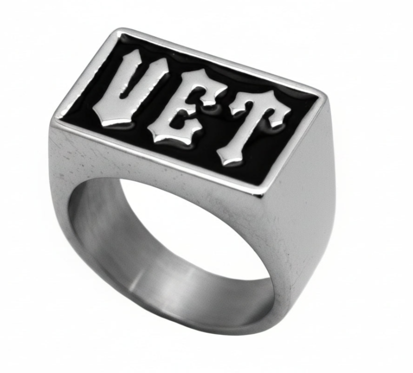 A Great Military Signet Ring, "VET," is Perfect for Any Veteran Service Member. Whether You've Served in the Military or Know Someone who has, this "VET" Signet Ring is a Meaningful Way to Honor their Service. The Unisex Design is crafted from Durable 316L Stainless Steel. It's Simple yet Bold rectangular top Showcases Precise Laser-Cut "VET" Lettering on an Inlaid Black Enameled Background, making it Truly Eye-Catching!