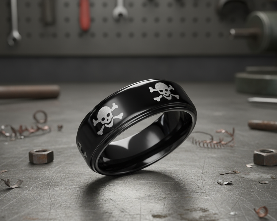 The White Skulls and Crossbones Design Boldly Encircles the Entire Black Spinner Band on the outside, adding a Touch of Rebellious Charm. Our Black Stainless Steel Spinner Ring comes in sizes for Both Men and Women, making it ideal for a Matching Set or even a Unique Wedding Band. The Band's width varies slightly with finger size, ranging from 6.5mm (sz5) to 7.5mm (sz16). Who said Wedding Bands can't have a Little Edge?
