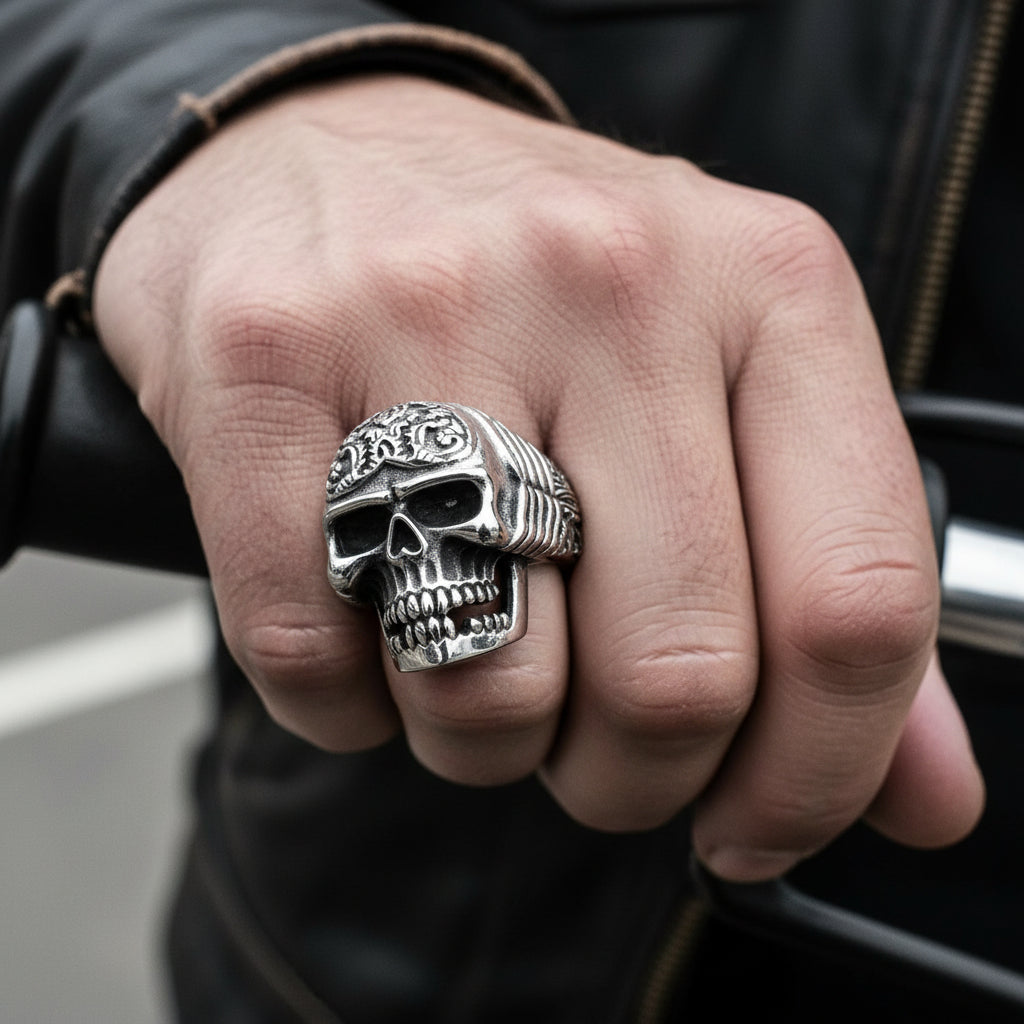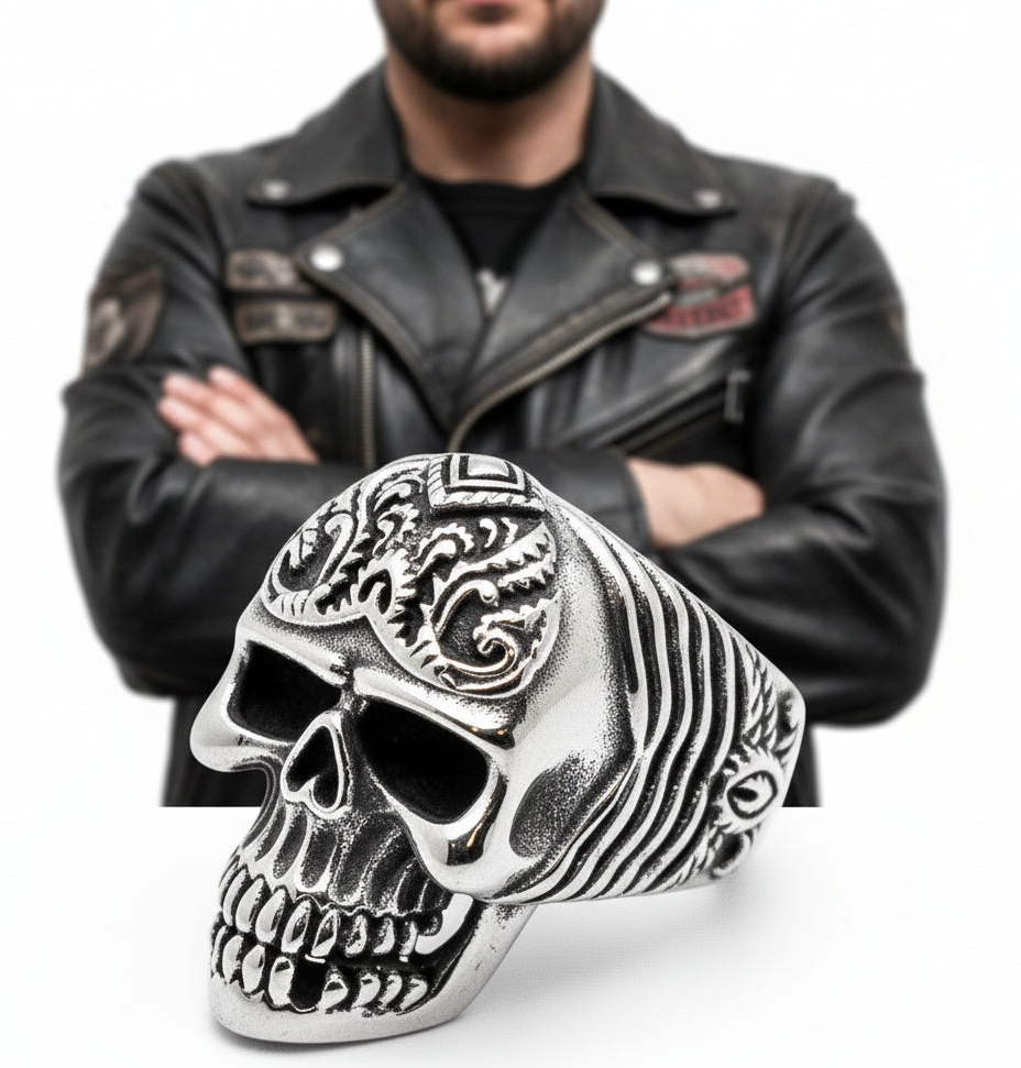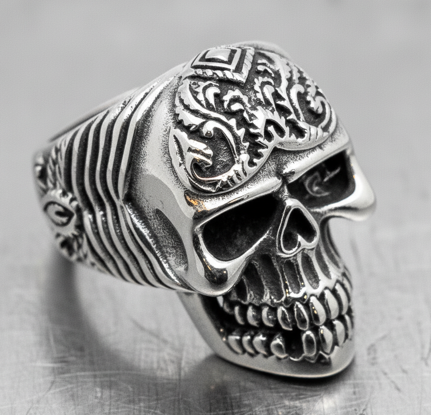 A Bold and Powerful Biker Skull Ring Featuring Intricate Forehead Designs that flow Dramatically down both sides of the 1.3-inch-long Skull. Carefully placed Black Accents on High Polished Stainless Steel! this Substantial Piece Tips the Scales at an Impressive 33 grams. Wear it if You dare!