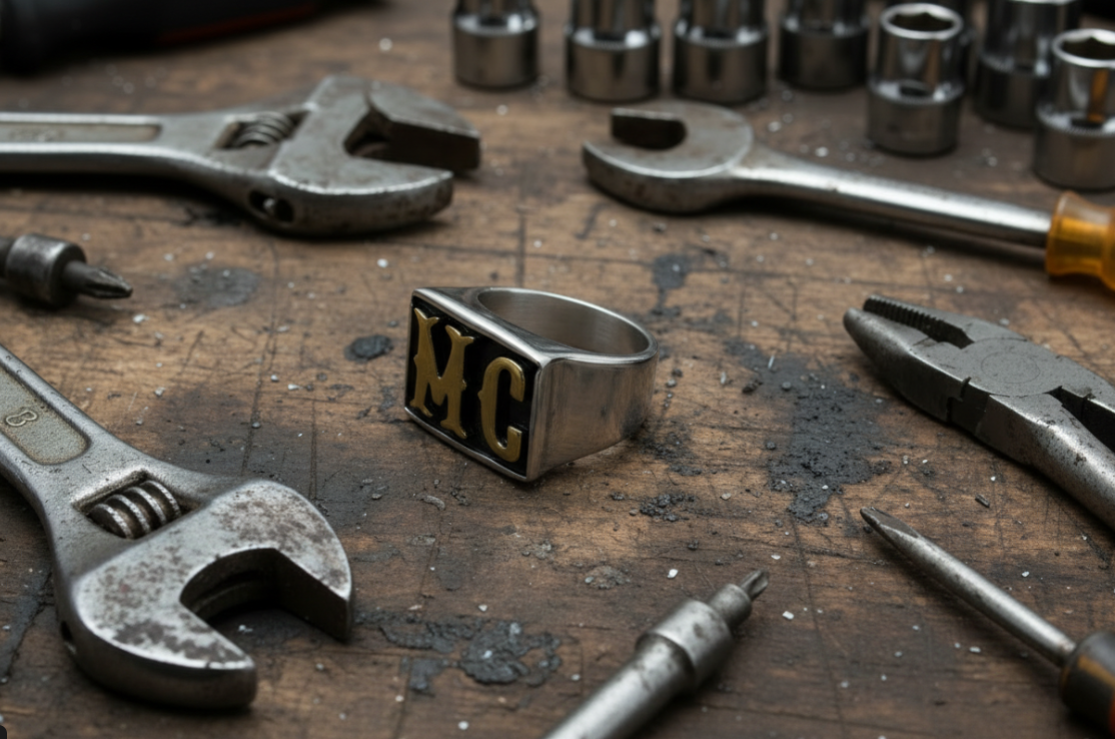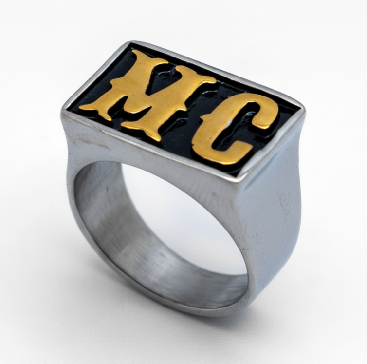 Our Gold Edition "MC" Signet Ring Features Raised Gold Plated Letters set against an Inlaid Black Enameled Background, All Crafted from High-Polished Stainless Steel. Make a Statement and Show your Club Identity with this Authentic Biker Stainless Steel Ring.