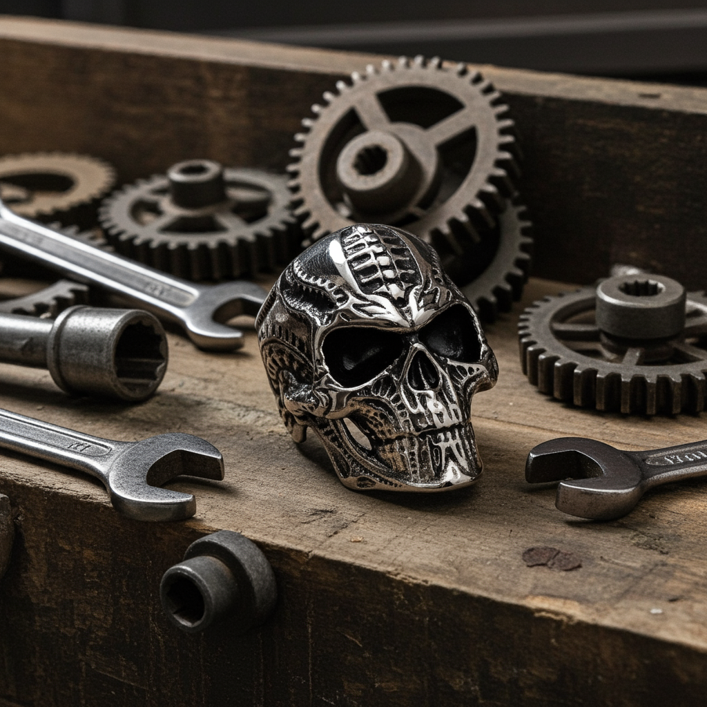 Men's big skull ring with a biomechanical look to it. nice wide shank gives this skull ring a secure fit and feel. Made by Heavy Metal Jewelry.