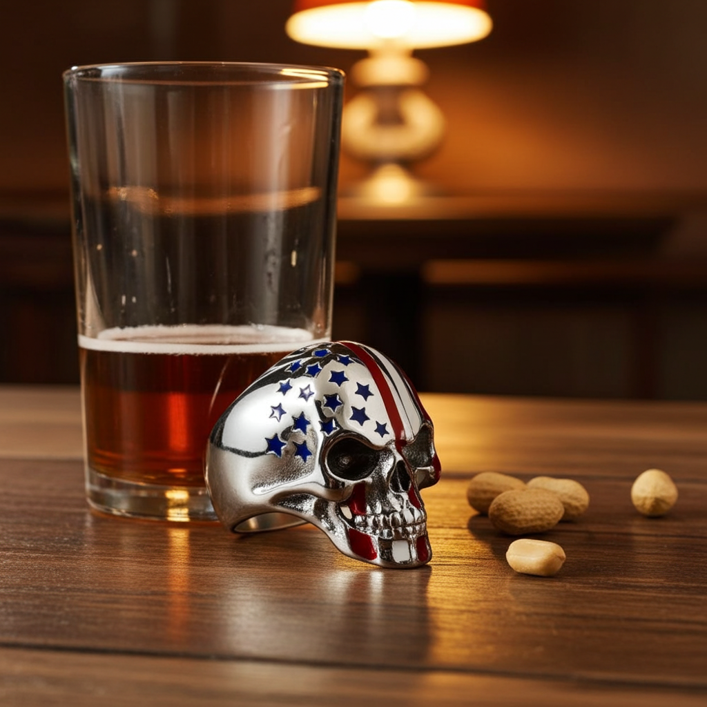 The American Flag Skull Ring Showcases Bold Red and White Enamel Stripes, with Laser-Cut Stars on the Skull’s Crown Filled with Blue Enamel and Striking Black Eyes for a Standout Look. Solid Inside, this Hefty, High-Polished Stainless Steel Piece is Built to Last, making it a Must-Have for Any All-American Biker.