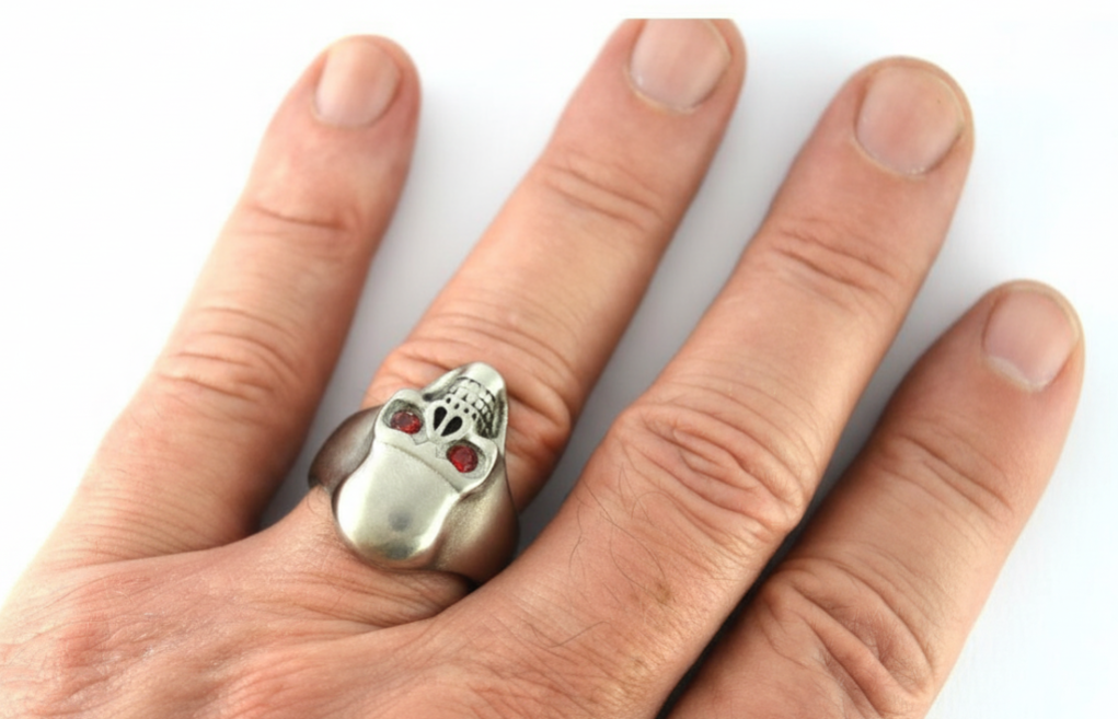 A Biker Jewelry Classic, the Brushed Finish Skull Ring with Red Eyes is sure to Stand Out in any crowd with its Brushed Satin Finish and Imitation Red Ruby Eyes. This Heavy-Duty Stainless Steel, one inch Tall Skull Ring Features a Solid Interior for Lasting Durability.