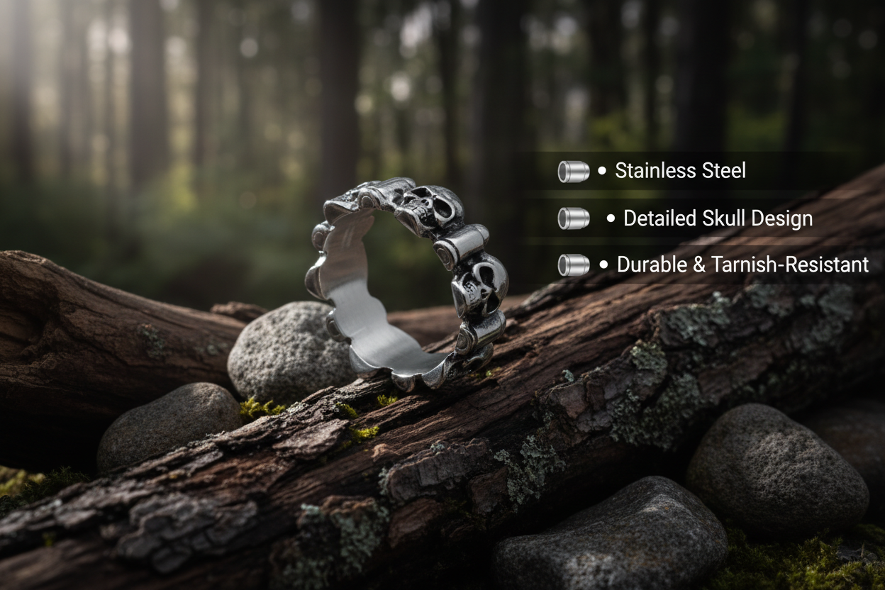 Sporting a Fierce Parade of Alternating Skulls and Bullets around its Bold 8mm wide Band, This Polished Stainless Steel Ring, complete with Ominous Black Accents, Ensures No One is Confused.